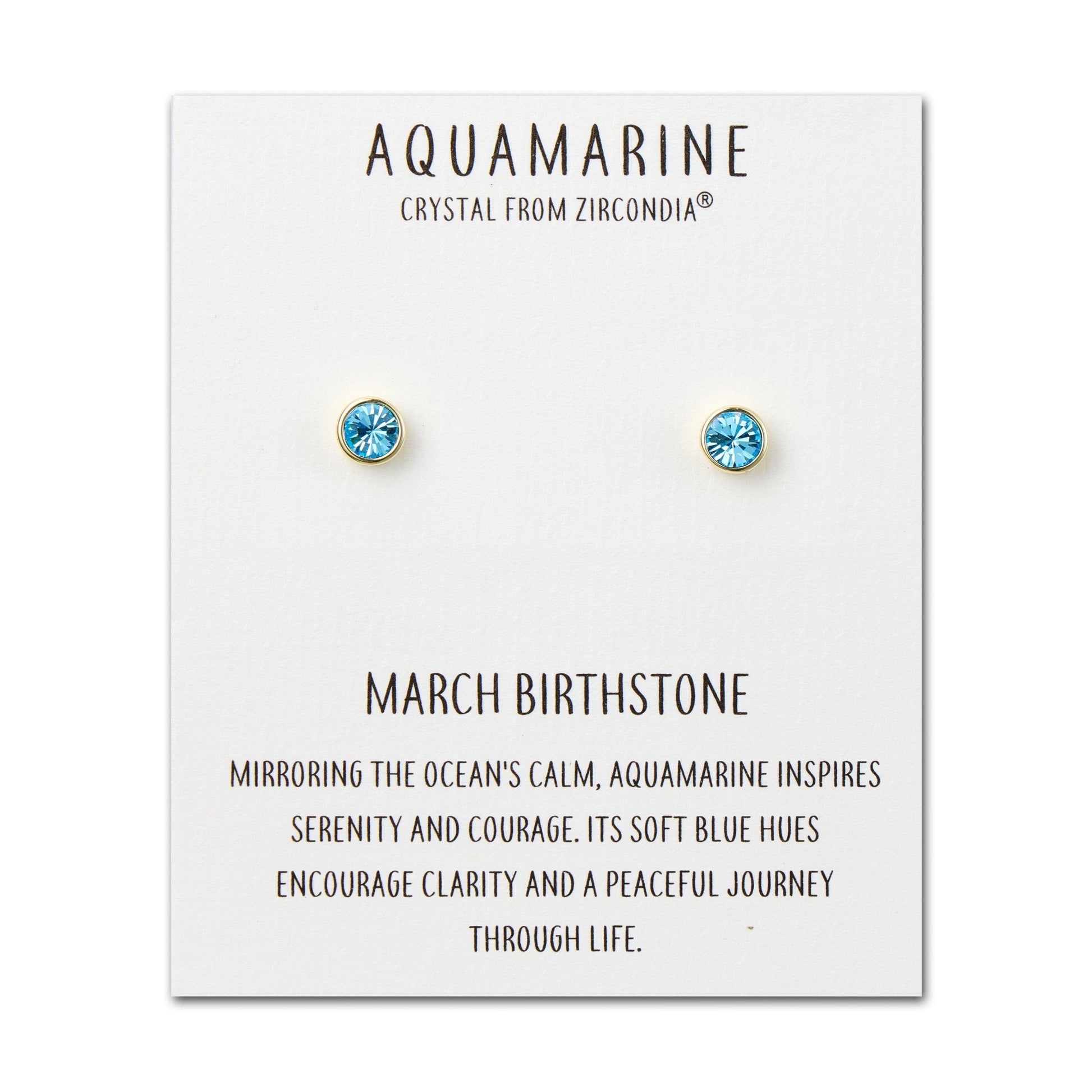 These Philip Jones gold plated March (Aquamarine) Birthstone Earrings are the perfect way to show off your birth month in style! Crafted from silver plated brass alloy, each earring is set with a hypoallergenic 6mm round Zircondia® crystal for a luminous, eye-catching look. Packaged in a gift pouch with a quote card, these earrings make a meaningful and thoughtful gift.