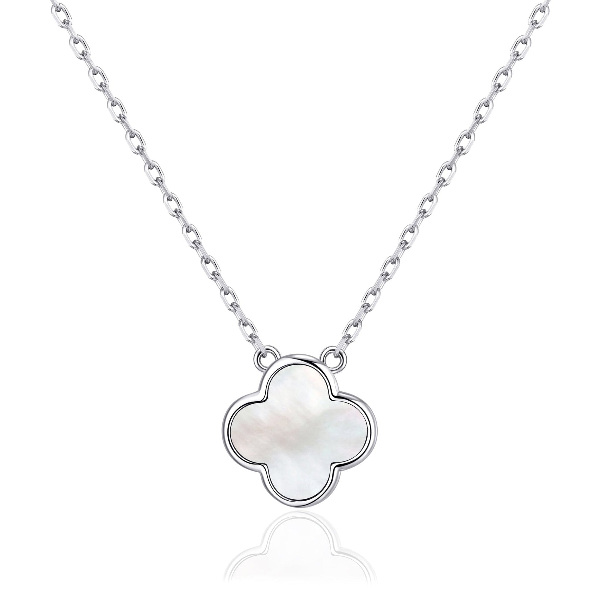 Experience the beauty of genuine gemstones with the Mother Pearl Clover Necklace from Philip Jones. Crafted with silver plating and a hypoallergenic base metal, this pendant necklace features a stunning pearl stone in the shape of a clover. Its pendant measures 11.5mm and hangs on a 43cm chain with a 5cm extender. This gorgeous piece comes packaged in a convenient gift pouch.