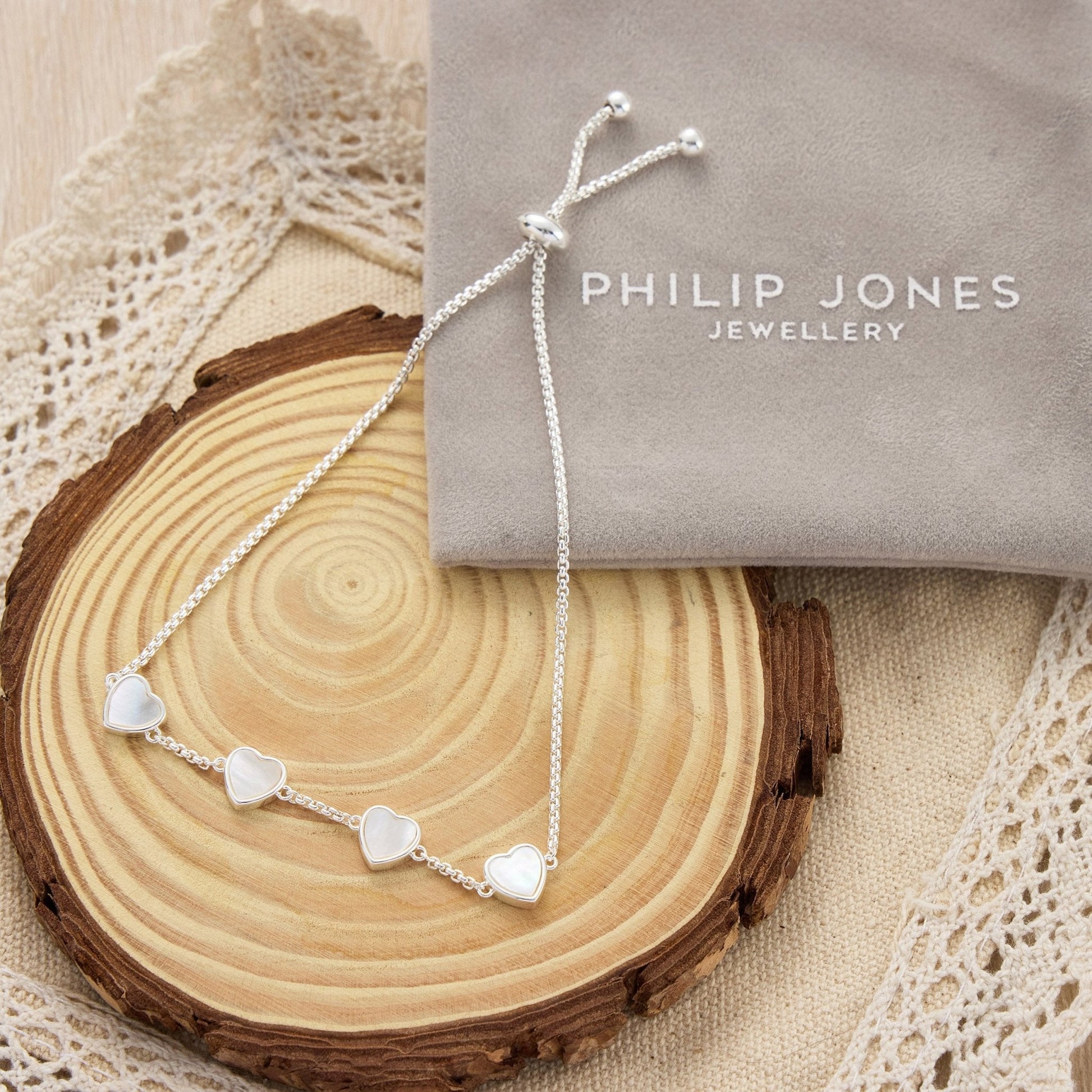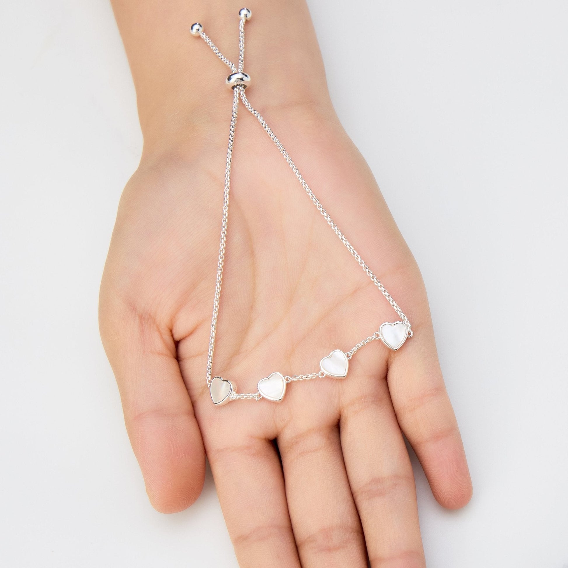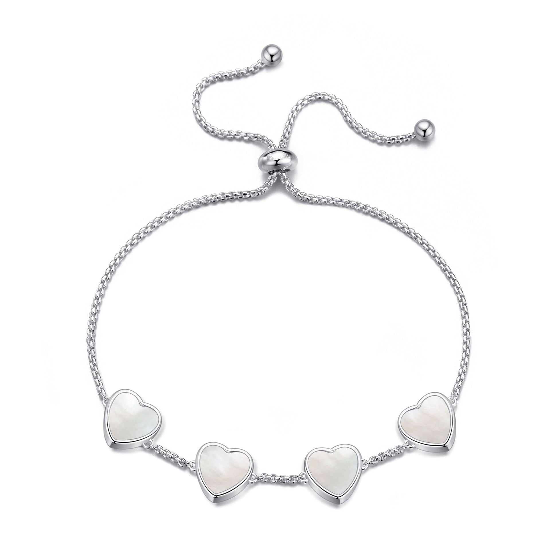 This stunning bracelet features pearlescent gemstones and a silver-plated brass alloy base, ensuring both beauty and durability. Mother of Pearl heart-shaped stones add a touch of elegance, while the adjustable slider closure allows for a perfect fit. The bracelet comes in a stylish gift pouch, making it the ideal present for loved ones.