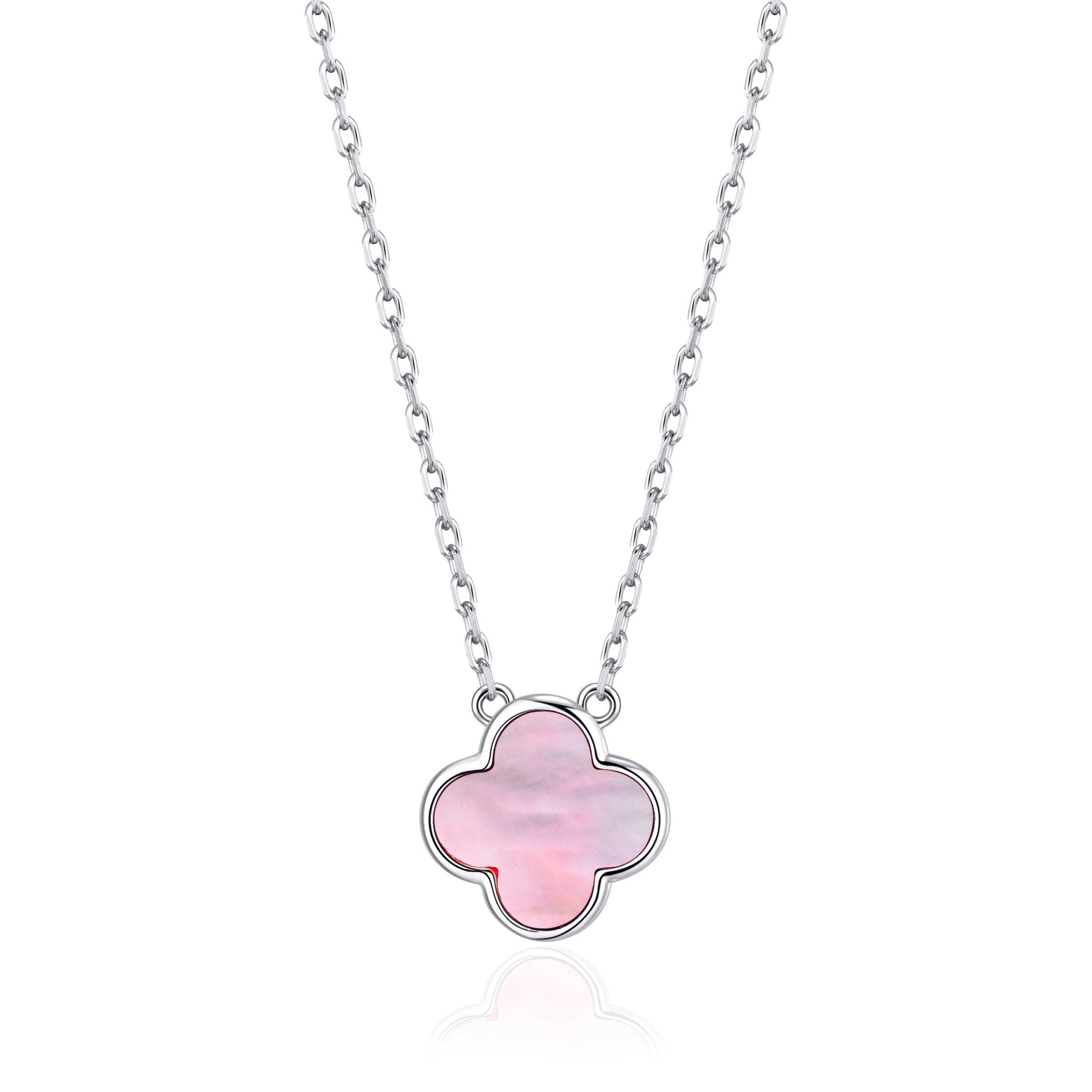 Experience the beauty of our Pink Mother of Pearl Clover Necklace from Philip Jones. Crafted with silver plating and a hypoallergenic base metal, this pendant necklace features a stunning pink stone in the shape of a clover. Its pendant measures 11.5mm and hangs on a 43cm chain with a 5cm extender. This gorgeous piece comes packaged in a convenient gift pouch.