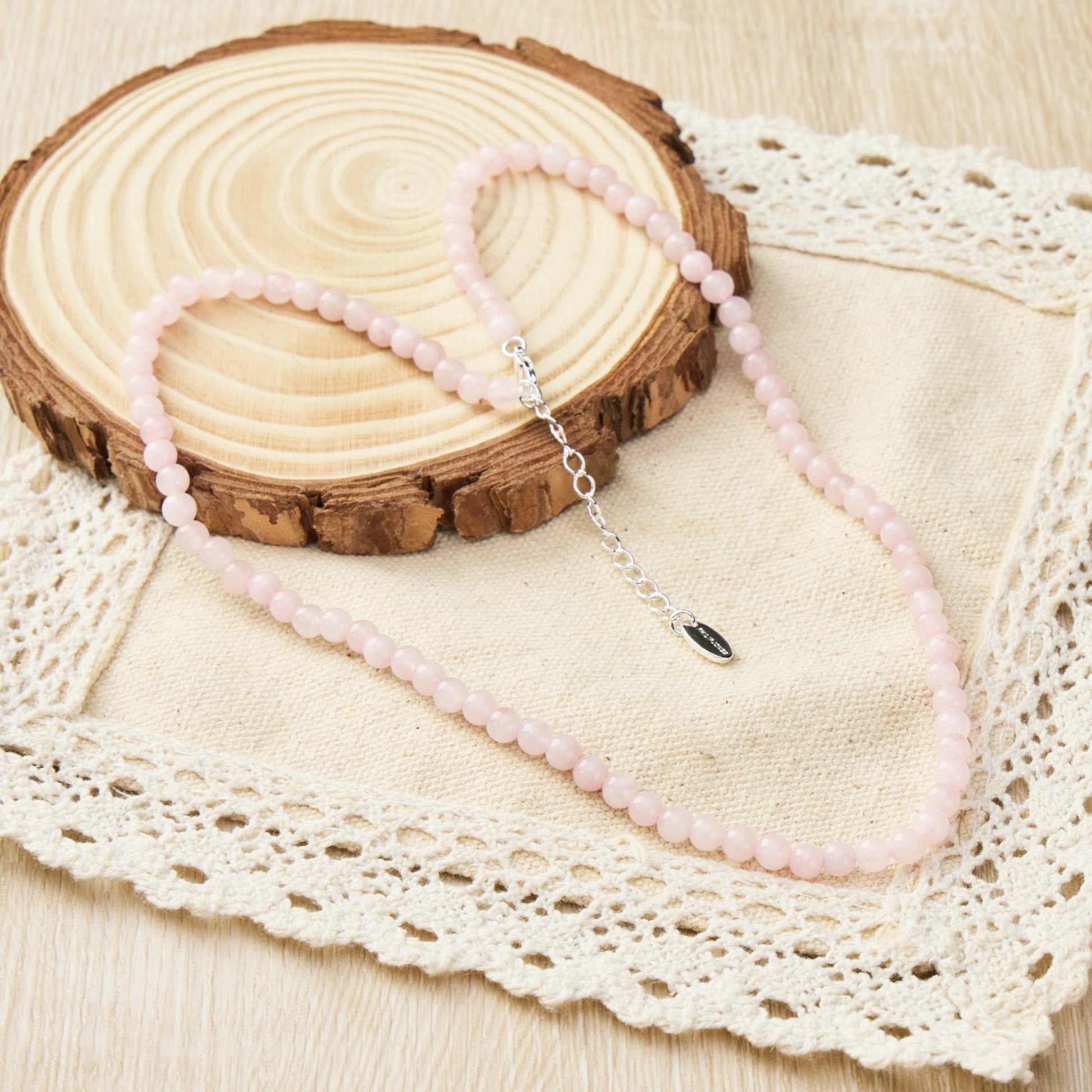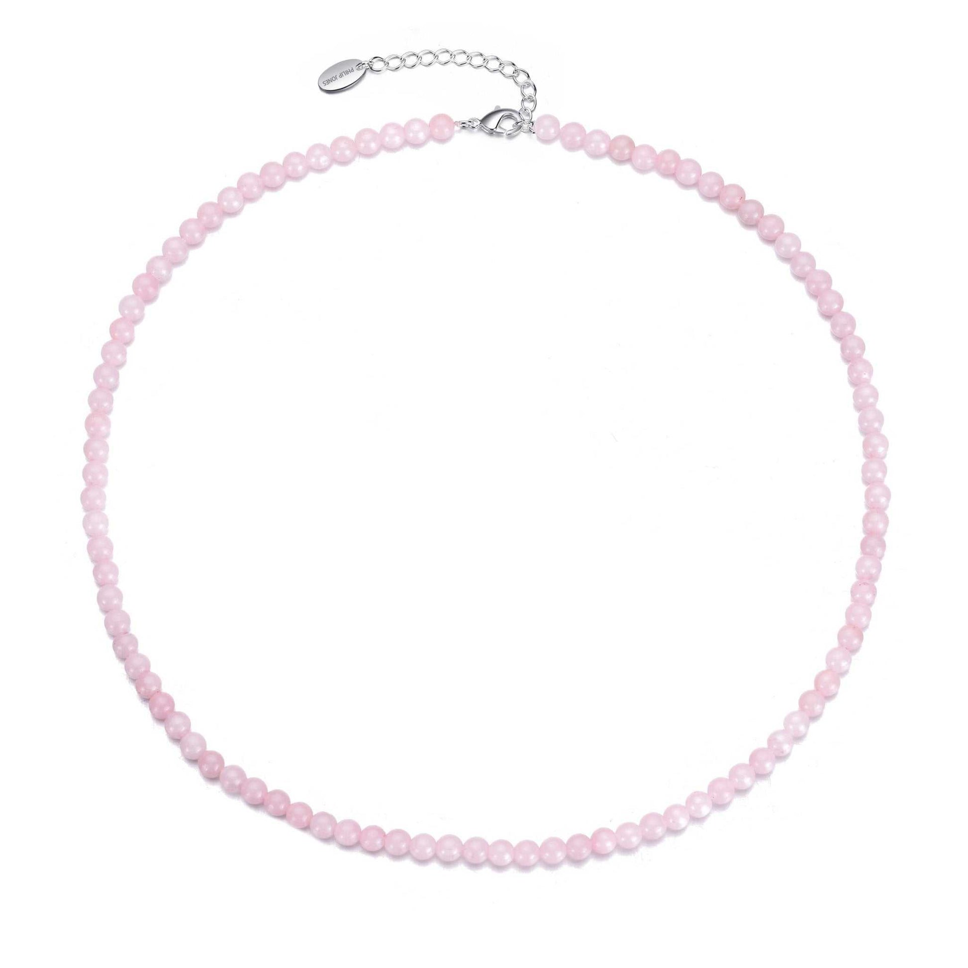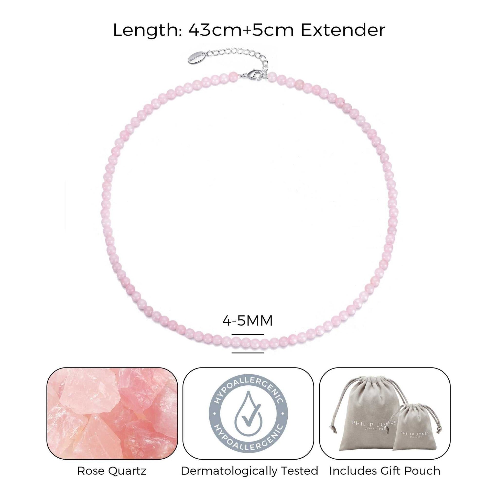 Crafted with genuine gemstones, this silver plated necklace by Philip Jones features a high polished finish that adds a touch of elegance. The beaded design, with 4-5mm round rose quartz stones in a beautiful shade of pink, adds a pop of colour to any outfit. Complete with a lobster claw closure, it weighs 14.88g and comes in a 9cm x 10cm gift pouch.