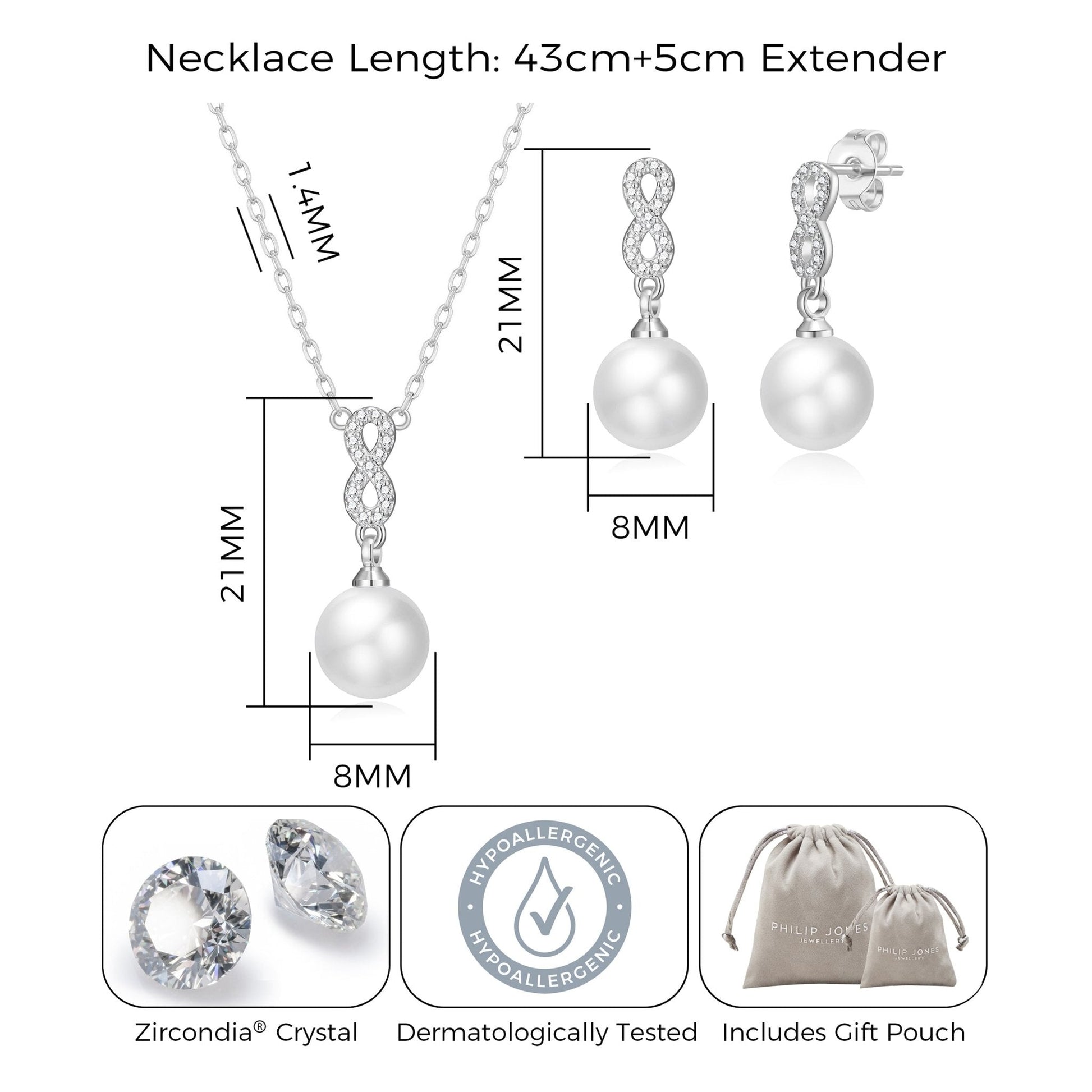 Experience the exquisite beauty of our Silver Plated Infinity Pearl Drop Set featuring dazzling Zircondia® Crystals. This hypoallergenic set, crafted with precision and care, is a true celebration of love and commitment. Each piece is adorned with a lustrous 8mm Shell Pearl and sparkling 1mm Zircondia® crystal. Complete with a butterfly clasp and gift pouch with a meaningful quote, this set makes the perfect gift for your loved ones on your wedding day..