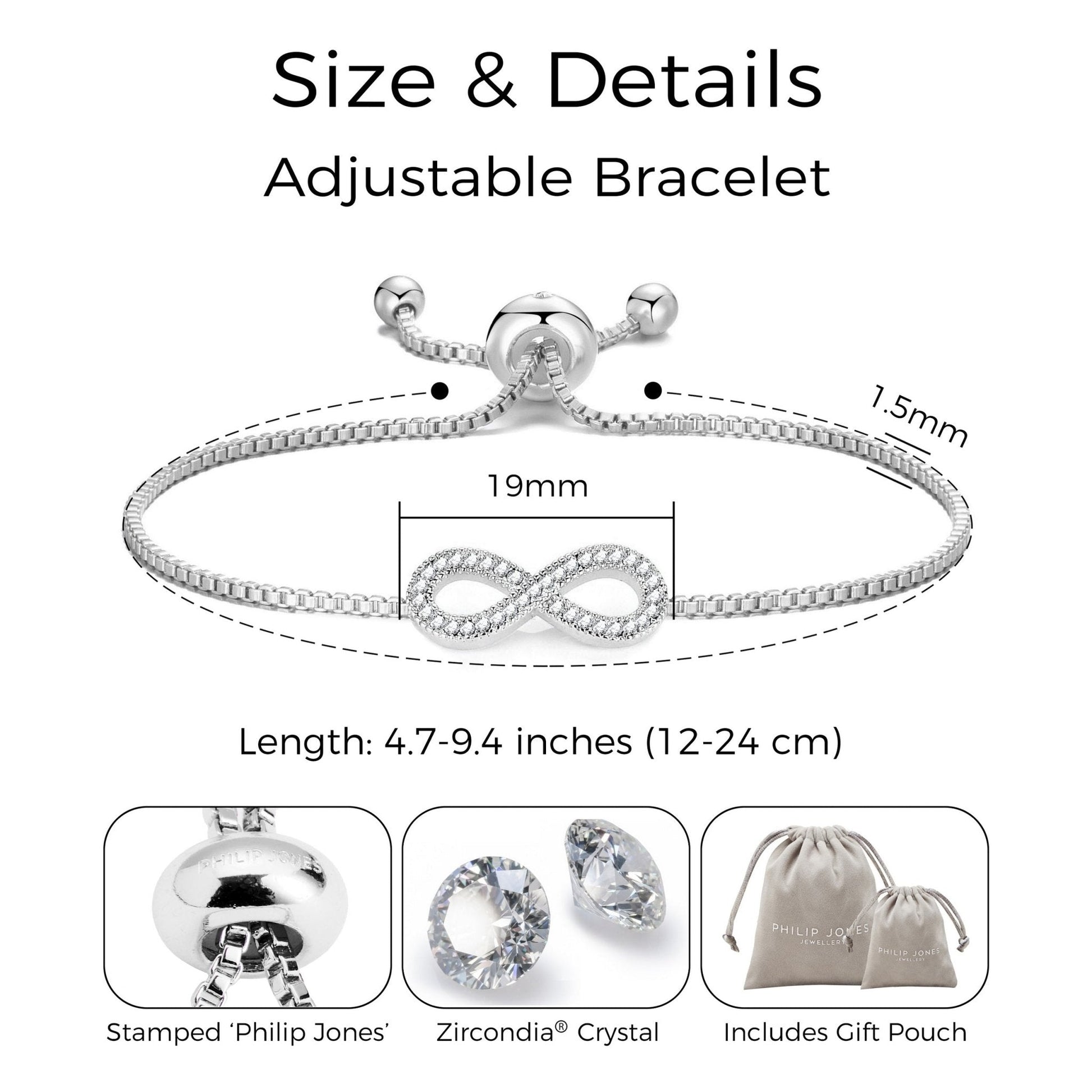 Celebrate your wedding day with this Silver Plated Infinity Wedding Bracelet, perfect for brides, bridesmaids, and bridal parties. Featuring sparkling Zircondia® Crystals, this hypoallergenic friendship bracelet adjusts from 12cm to 24cm for a comfortable fit. The elegant slider closure and delicate charm symbolize enduring love, making it a meaningful bridal gift. Packaged in a gift pouch with a heartfelt quote card, it’s an ideal keepsake to cherish forever on your special day.