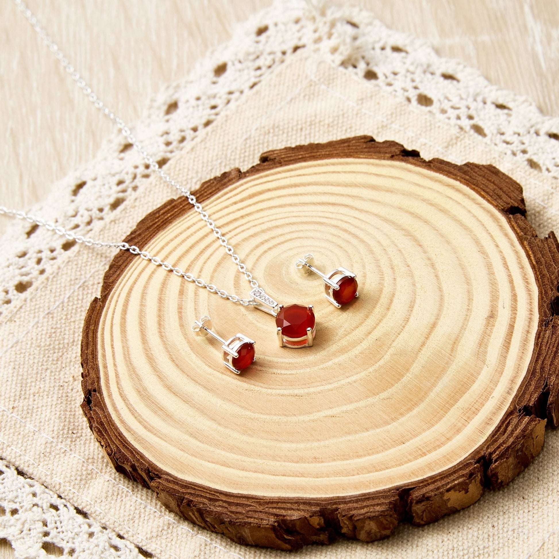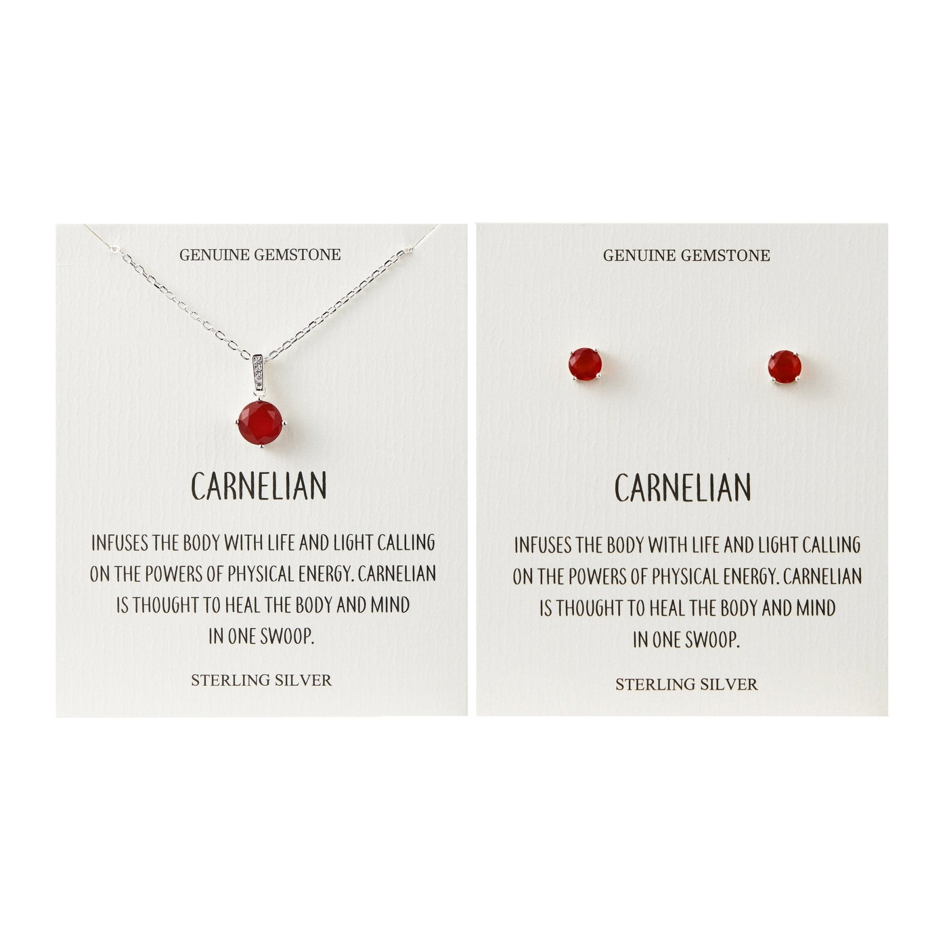 Experience the magic of genuine gemstones with our Sterling Silver Carnelian Set. Adorned with beautiful 925 stamped silver, these earrings and pendant necklace feature vibrant round carnelian stones in a 4 prong setting. Hypoallergenic and lightweight, these pieces are perfect for everyday wear. Add a touch of elegance to any outfit with this stunning set. Comes beautifully packaged in a gift pouch with two quote cards for added inspiration.
