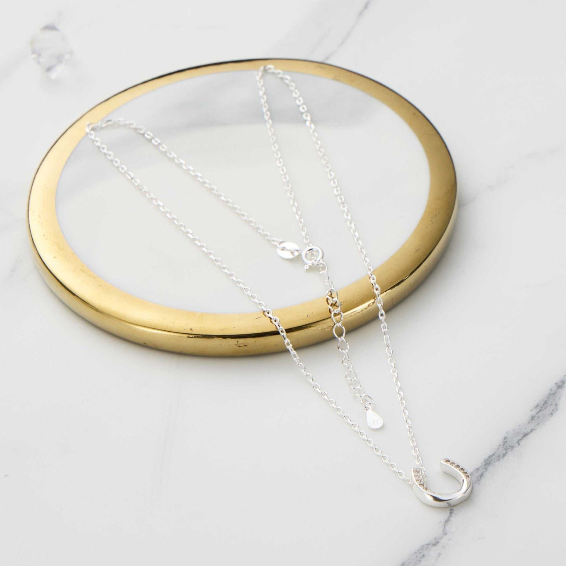 Crafted from the finest materials, this remarkable Sterling Silver Horseshoe Necklace is adorned with brilliant Zircondia® Crystals that add a touch of elegance and sparkle. The intricate pendant, stamped 925 and hypoallergenic, hangs from a sturdy 43cm cable chain with a 5cm extender for the perfect fit. Light and versatile at just 3.1g, this necklace is the perfect addition to any outfit. Comes in a charming 7cm x 5cm gift pouch for a lovely presentation.