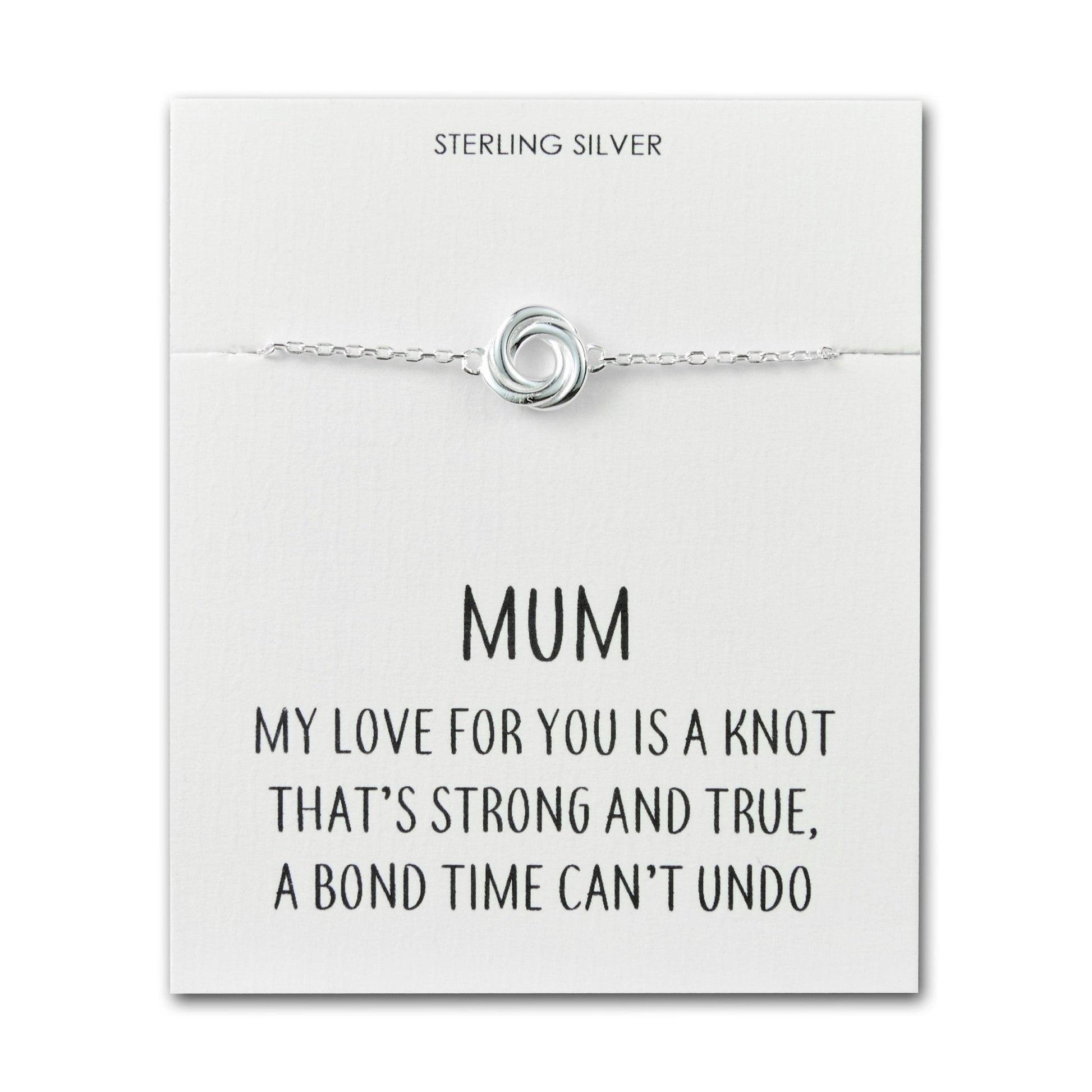 Experience the value of the Philip Jones Sterling Silver Mum Quote Knot Bracelet, made from hypoallergenic, stamped 925 sterling silver. This stunning piece features a delicate chain link design with dimensions of 10.5mm (H) x 10.5mm (W), and measures 17.8cm with an additional 2.5cm extender. The closure is a secure lobster claw and the weight is 2.4g, perfect for everyday wear. Packaged in a charming gift pouch with a meaningful quote card, this bracelet is sure to inspire and delight.
