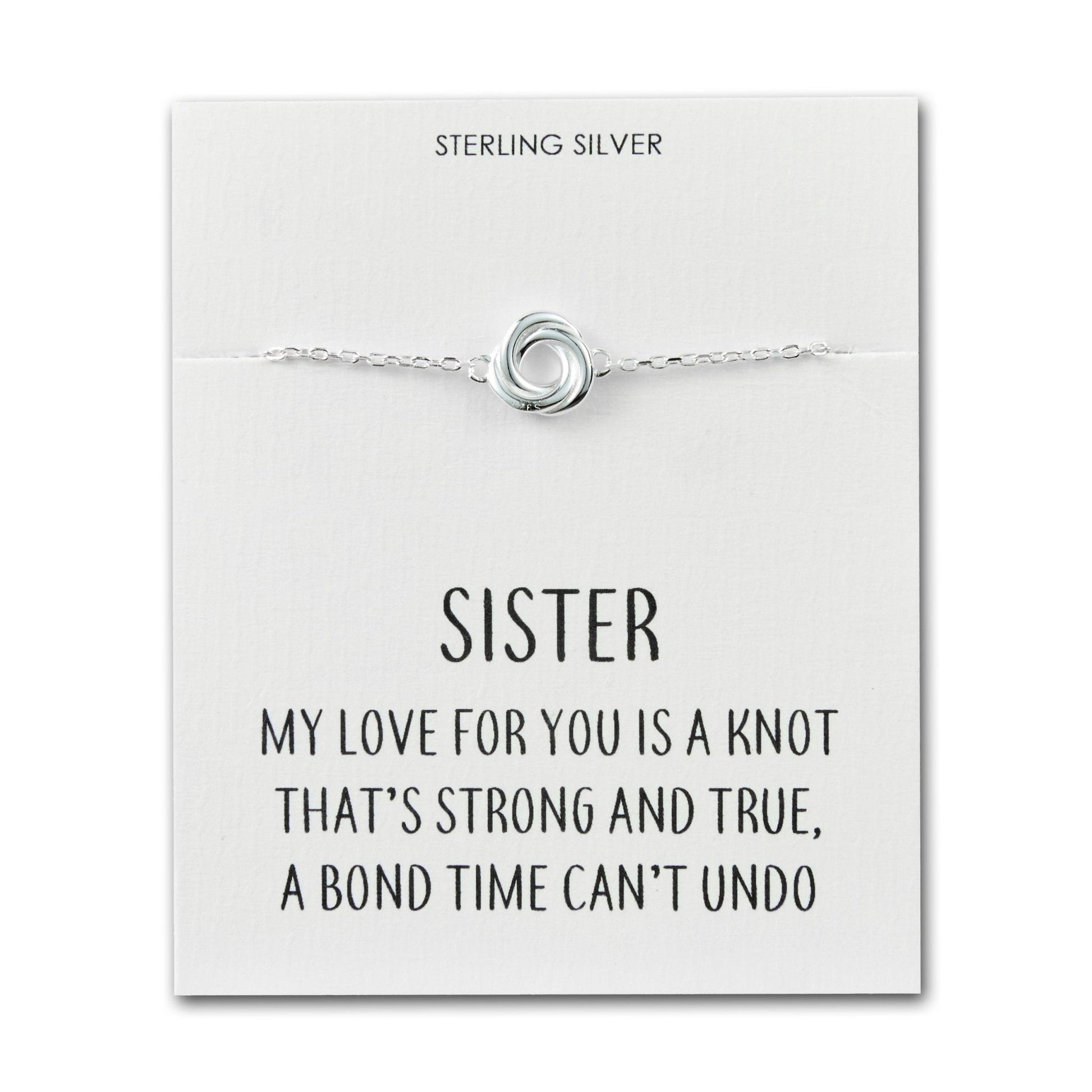 Experience the value of the Philip Jones Sterling Silver Sister Quote Knot Bracelet, made from hypoallergenic, stamped 925 sterling silver. This stunning piece features a delicate chain link design with dimensions of 10.5mm (H) x 10.5mm (W), and measures 17.8cm with an additional 2.5cm extender. The closure is a secure lobster claw and the weight is 2.4g, perfect for everyday wear. Packaged in a charming gift pouch with a meaningful quote card, this bracelet is sure to inspire and delight.